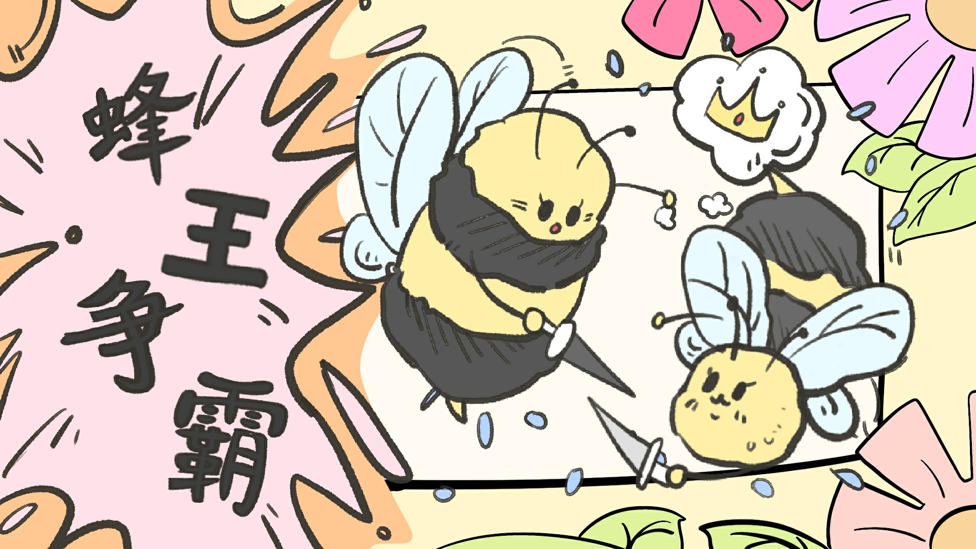 2025.10.16 上新 阳光下两只蜜蜂争蜂王,一只往前凑着要进攻,一只往后退却没示弱,翅膀都泛着半透明的光,黄黑条纹在草地上格外显眼,一起描绘蜂王争霸赛的场景吧