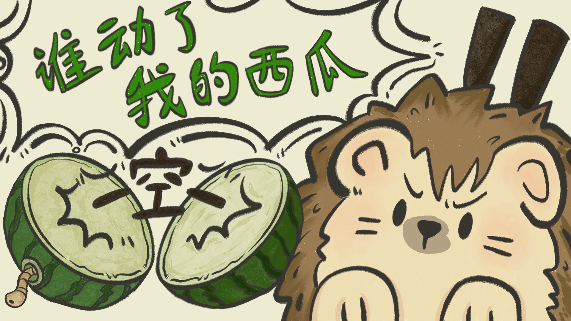 2025.11.6 上新 圆滚滚的西瓜裹着绿黑条纹,没切开时是饱满的弧线,切开后红瓤嵌着黑籽,但甜香里藏着小秘密..是谁动了我的西瓜!?