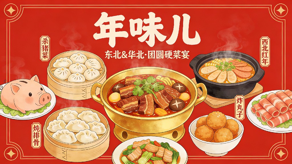 2026.1.13 上新 东北华北的年饭硬菜分量十足,酸菜白肉锅咕嘟冒泡,酱肘子色泽诱人,还有酥脆的炸茄盒,丰盛的菜品里,藏着最地道的北方年味儿。