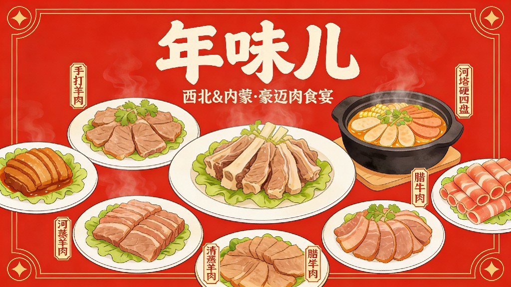 2026.1.13 上新 西北与内蒙的年味儿,藏在豪迈的肉食宴里。外酥里嫩的烤全羊、喷香的手抓羊肉,还有油润的馕坑烤肉,每一口都透着草原与戈壁的豪爽气息。