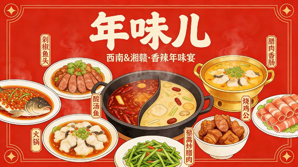 2026.1.13 上新 西南与湘赣的年味儿,藏在热辣喷香的宴席里。麻辣鲜香的火锅、香辣过瘾的剁椒鱼头,每道菜都透着浓郁的烟火气,辣得酣畅又喜庆。